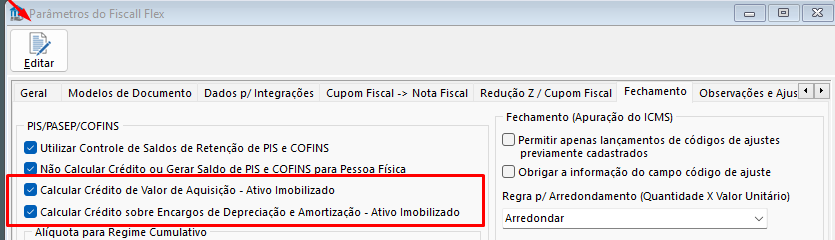 Para o cálculo do créditos de Depreciação e Amortização marcar as flags abaixo em Parâmetros do Fiscal Flex.