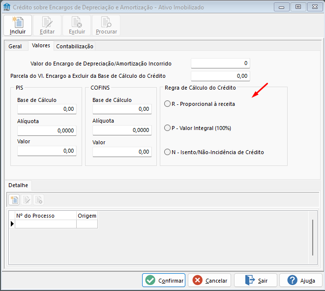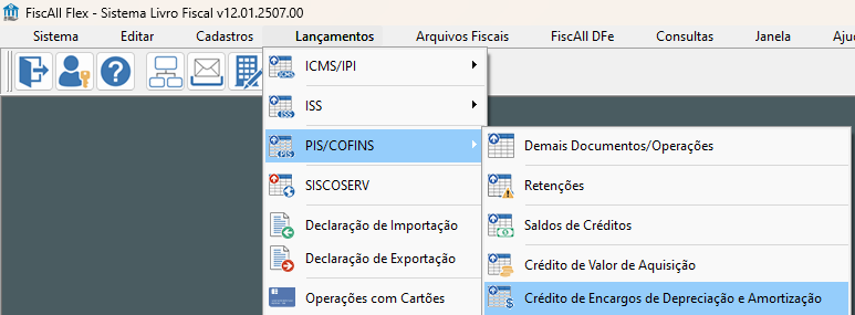 Efetuar os lançamentos manualmente no Fiscal Flex > Lançamentos > PIS/COFINS > Créditos de Encargos de depreciação e Amortização.