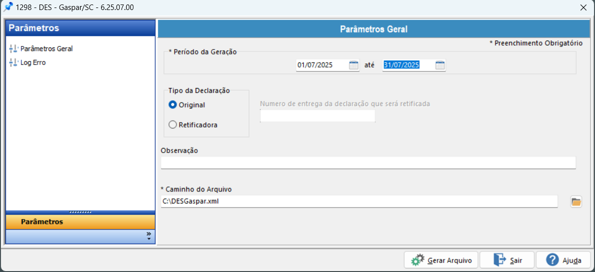 | Caminho do Arquivo | Diretório onde será salvo o arquivo XML gerado. Pode ser alterado clicando no ícone de pasta. |