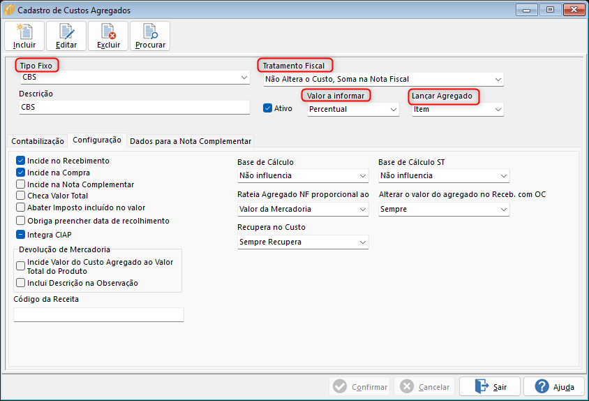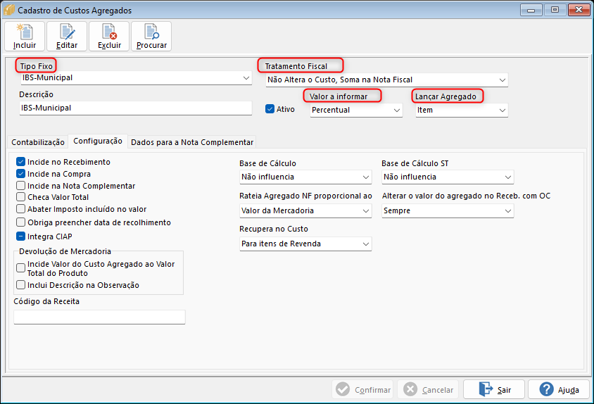 Para realizar os cadastros dos Custos Agregados:   CBS, IBS Estadual, IBS Municipal e Imposto Seletivo.