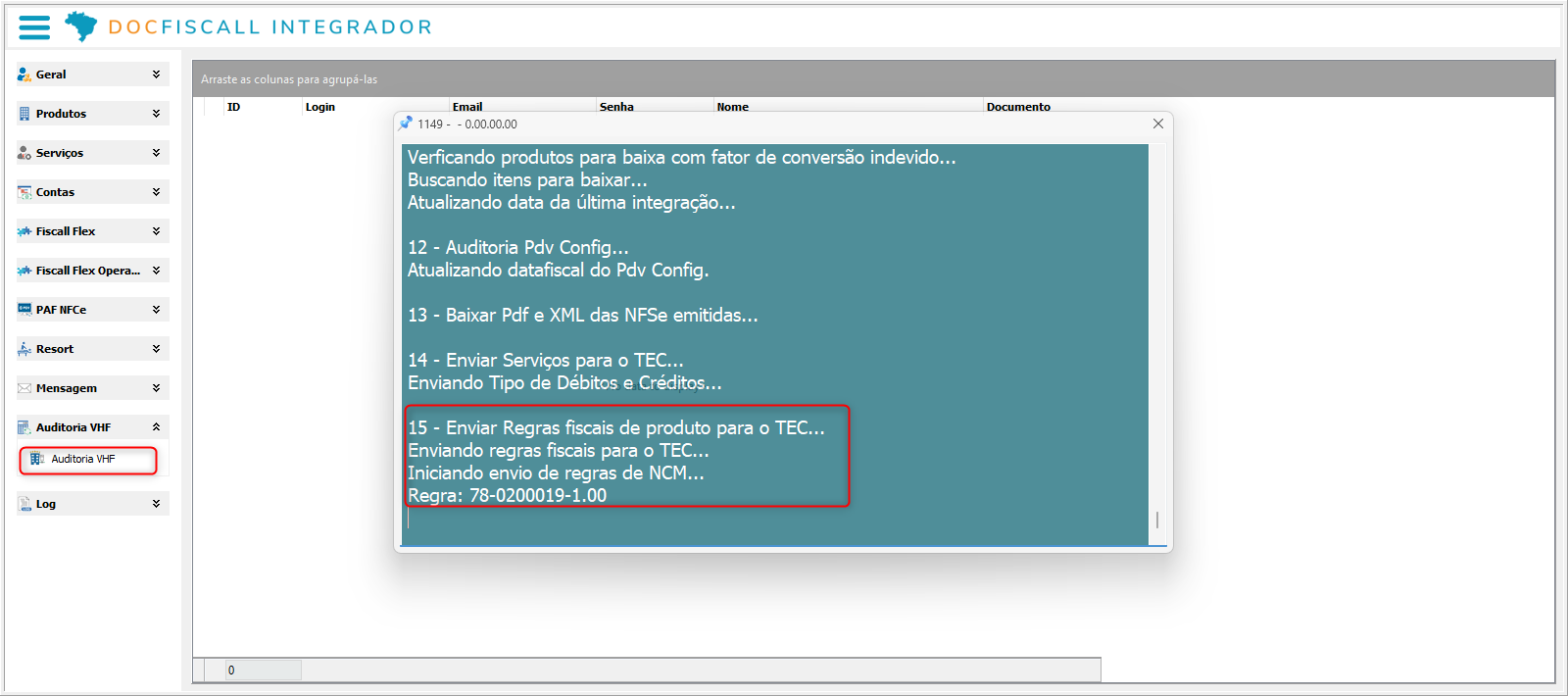 Acesse o Plugin DocFiscall Integrador, no menu:  Auditoria  VHF, para iniciar a rotina.