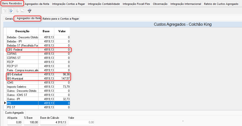 Lembre-se que em casos de recebimento manual, os valores dos custos agregados devem ser indicados na Aba Agregados do Item, para que haja a integração correta com o Fiscall Flex.