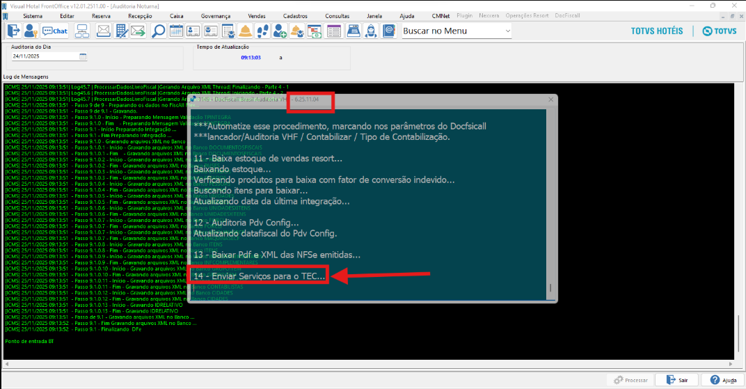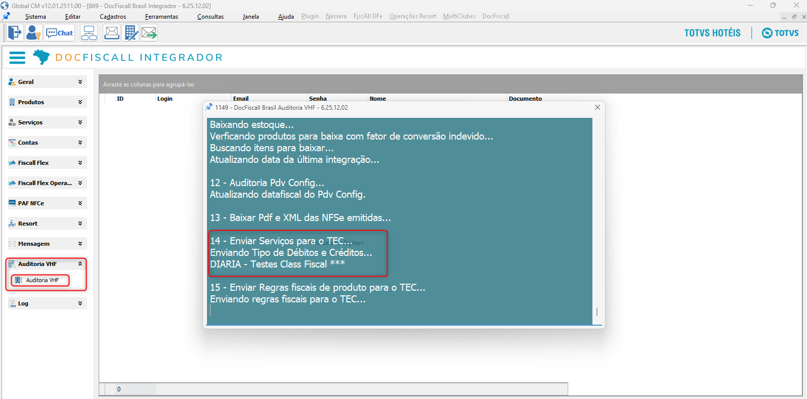 Quando for executado o passo 14 da Auditoria, que é a etapa de integração DocFiscall Brasil Auditoria VHF com o TEC.