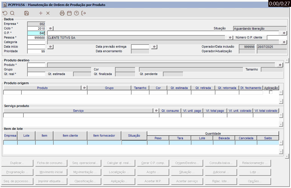 Imagem 2 - Item de lote da O.P. 848 (crua) finalizado com quantidade menor que a estimada.