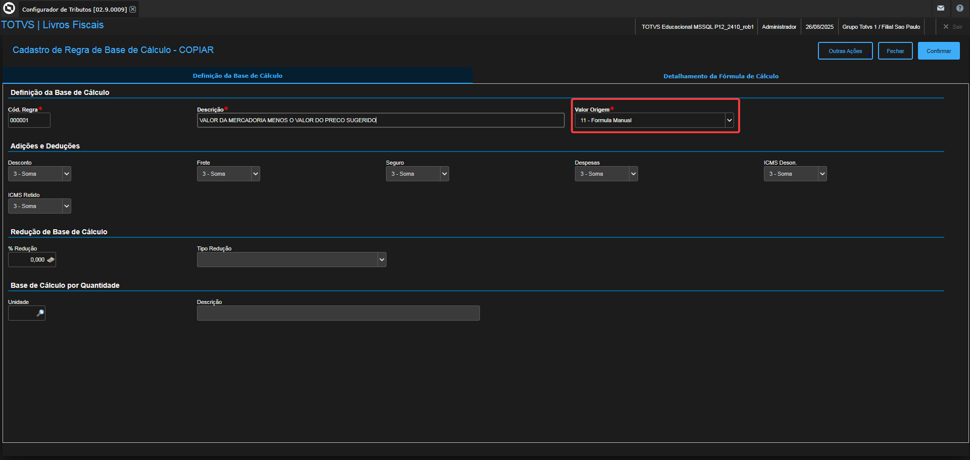 Após confirmar o cadastro da Base de Cálculo com a fórmula preenchida, é necessário vincular essa base de cálculo ao cadastro de Regras de Cálculo Documento Fiscal.