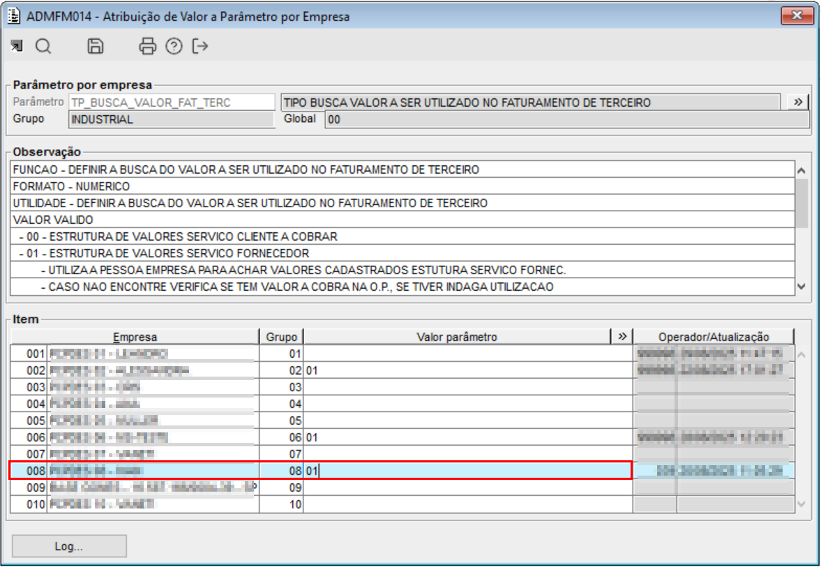 Imagens 1 e 2 - Necessário ajustar os parâmetros IN_UTI_FABRICACAO_TERC e TP_BUSCA_VALOR_FAT_TERC no componente ADMFM014.
