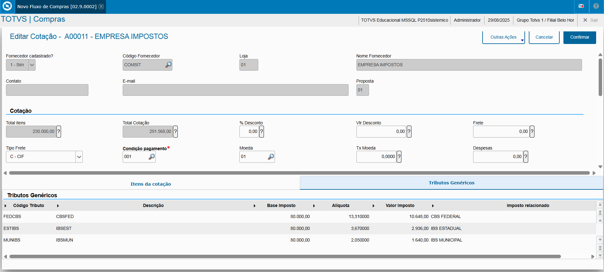 - Ainda na tela de edição de cotação, na parte de Impostos, foram incluídos os campos CBS Federal, IBS Estadual e IBS Municipal, para exibir os valores específicos desses impostos, quando estiverem configurados para a cotação e itens pertinentes;