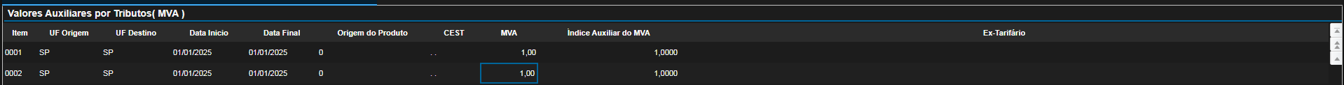 2 - Validação: Caso os campos UF Origem, UF Destino, Data Inicio, Data Final, Origem do Produto estejam preenchidos com o mesmo conteúdo em dois registros e o campo Ex-Tarifário estiver em branco, será informado que algum dos campos precisam ser diferentes, pois o registro está duplicado (essa validação funciona em todas as abas):