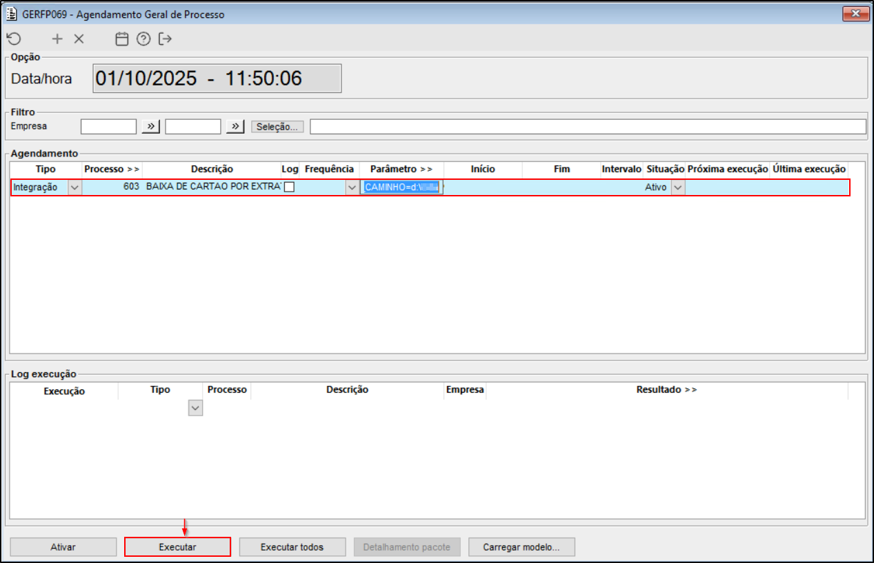 Imagem 01 - Acessar o componente GERFP069 e configurar o processo 603 (Baixa de cartão por extrato eletrônico automático) está sendo informado o diretório contendo os arquivos referente a GETNET e acionado o botão "Executar".