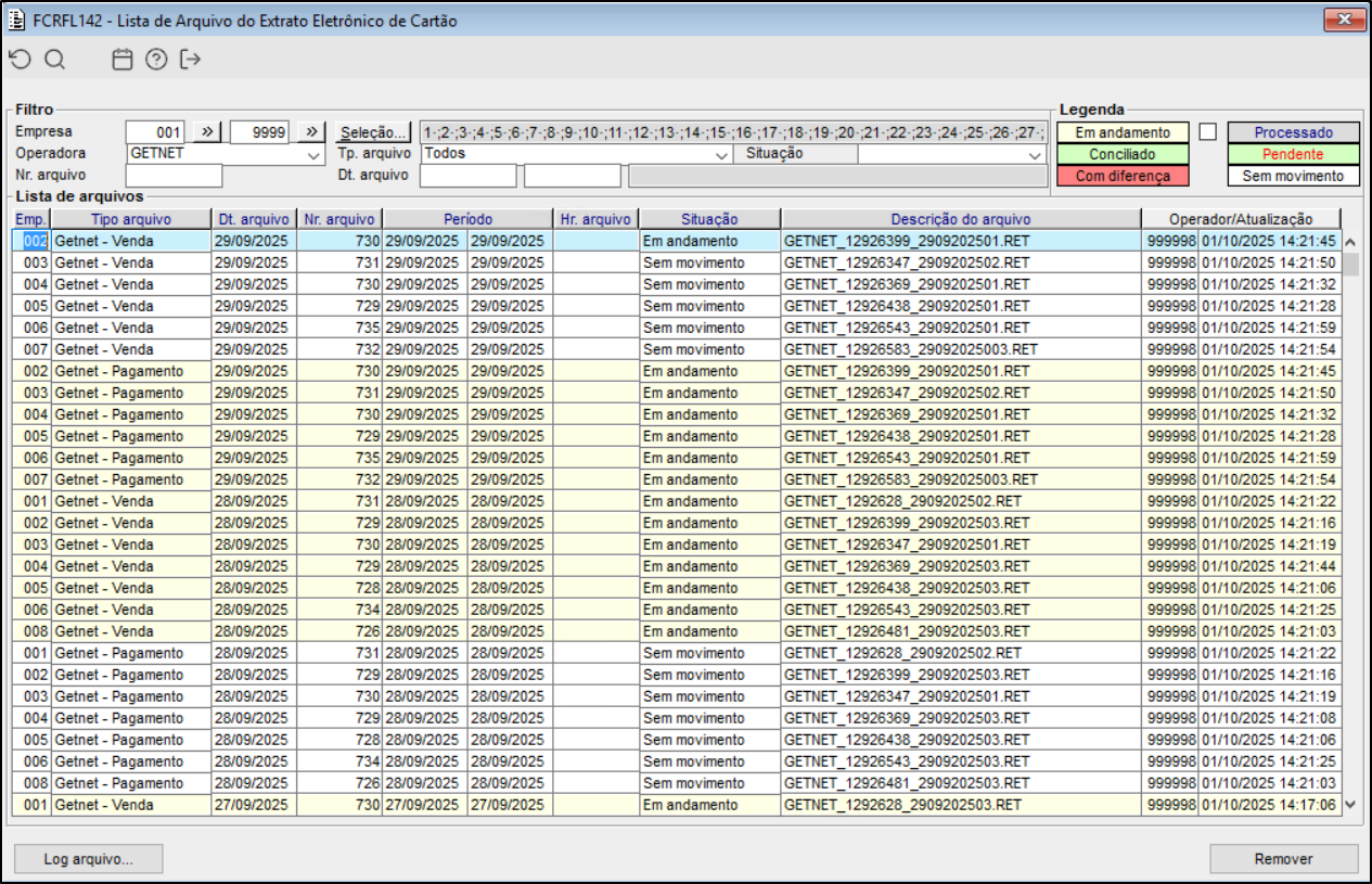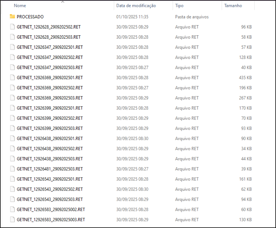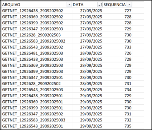 | Função: | Ao realizar o processo de baixa de cartão por extrato eletrônico, realizar a baixa para os arquivos referente ao banco GETNET em ordem crescente. |