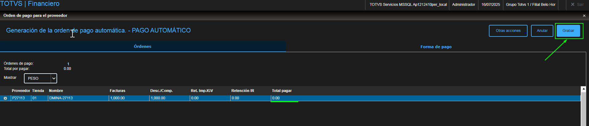 - DMINA-27113 DT Orden de pago que no utiliza banco y que compensa el total de una factura utilizando un pago anticipado (PA) PER