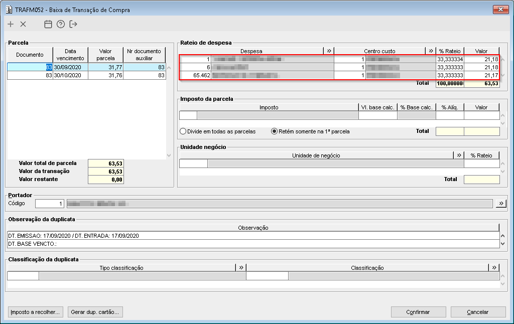 • 9644309 DVACOM-5841 DT Validar rateio de centro de custo