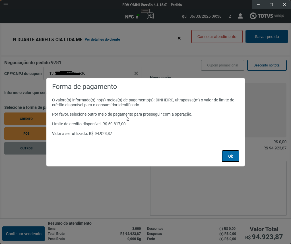 DT DVARLIVEPDV-41268 Pedido Desktop - Validar saldo limite de credito