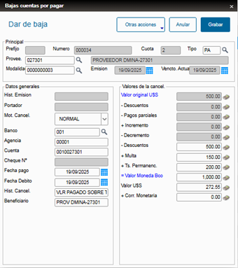 - DMINA-27301 DT Baja parcial de Pago Anticipado en moneda 2, con banco en moneda 1 y valores accesorios PER