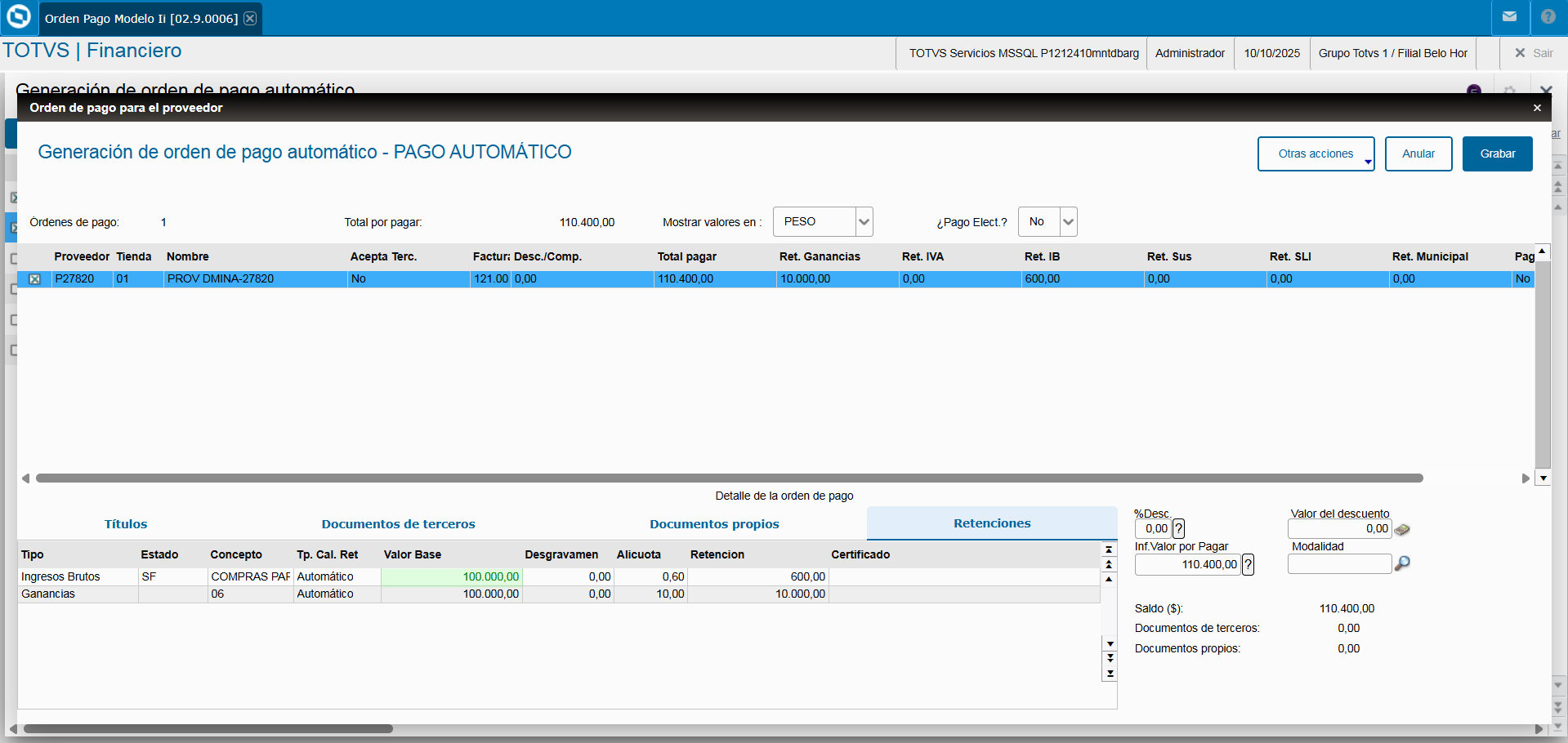 - En la sección "Detalle de la orden de pago" dirigirse a la sección "Retenciones"; validar que la base imponible informada para la retención de Ingresos Brutos corresponda al valor de la factura: