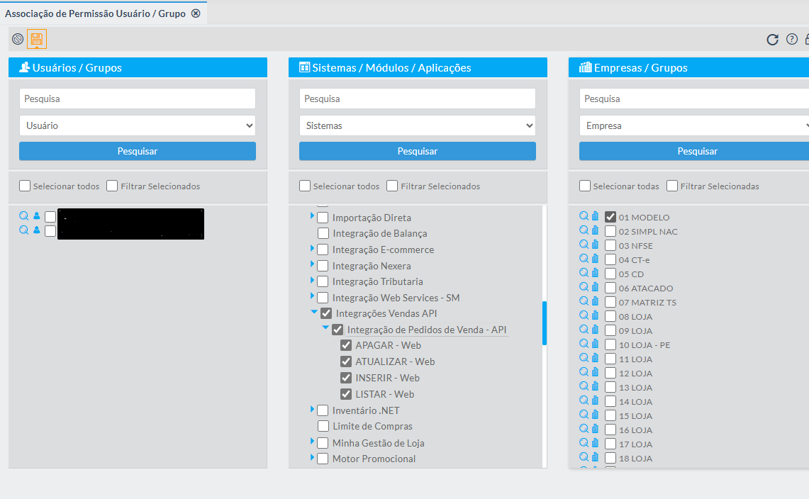 Para usuários que se autenticam com nível abaixo de Administrador será necessário configurar a permissão pra realizar as ações de integração com a API.