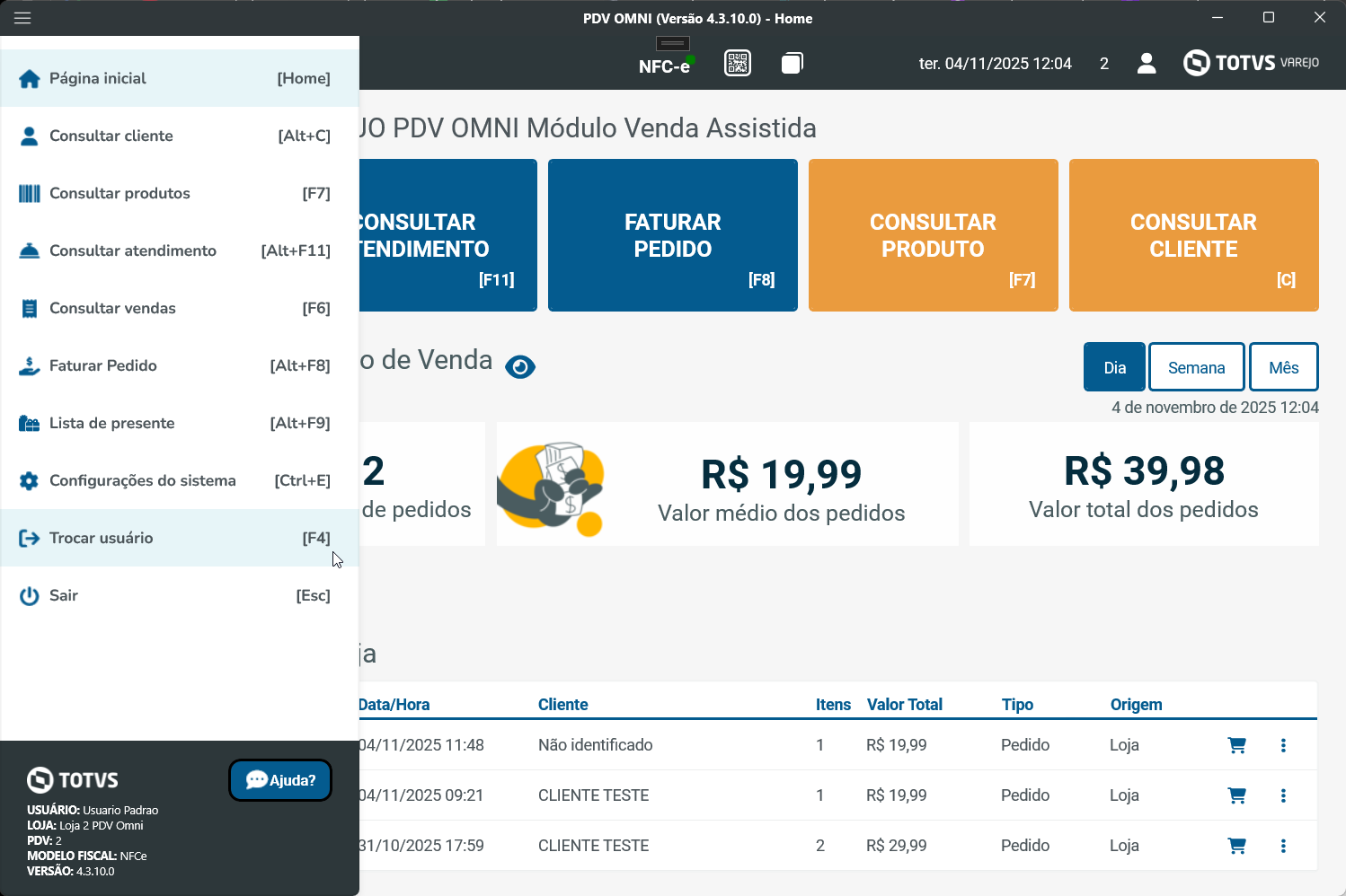 A opção também está disponível através do menu lateral de funções do PDV.
