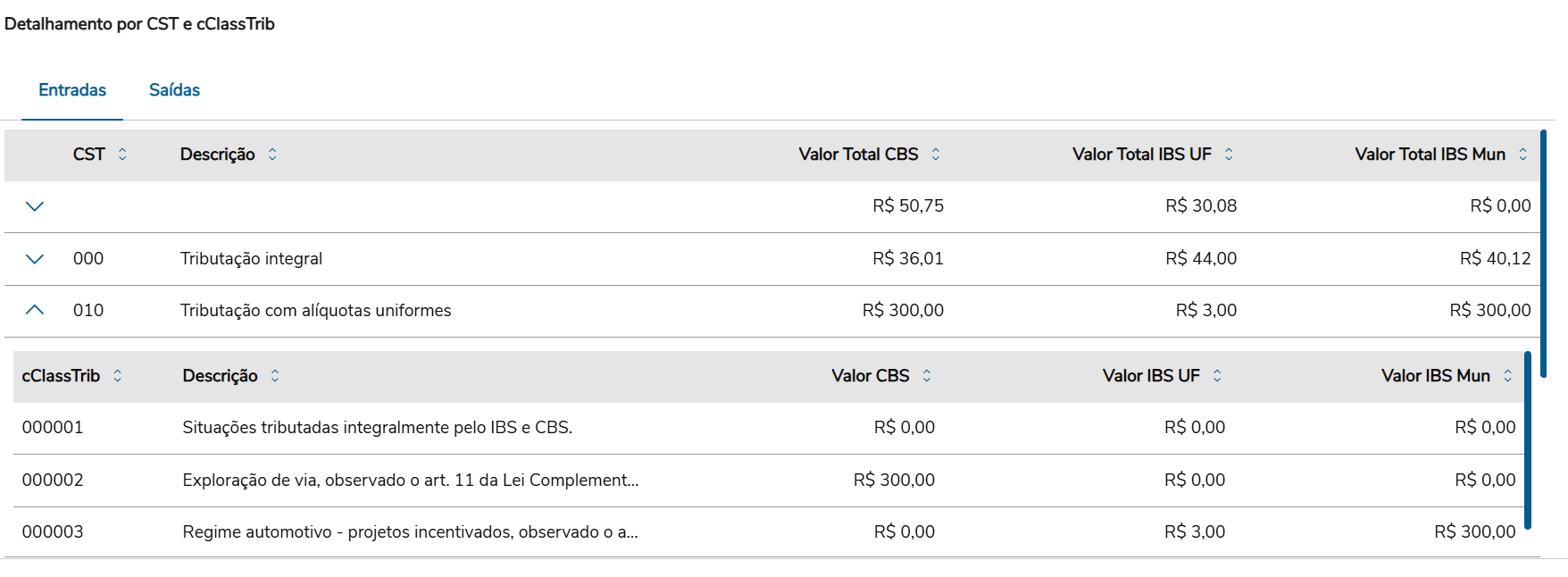 Nome: mtr-doctos-cst-trib Banco: movdis | Nome | Tipo | Formato | Descrição | Chave Primária | | num-id | DECIMAL | >>>>>>>>>>>>>>9 | Identificador | Sim | | cod-estab | CHARACTER | X(5) | Estabelecimento | Sim | | cod-periodo | CHARACTER | X(7) | Período | Sim | | cod-oper | CHARACTER | X(10) | Tipo Operação | Sim | | cod-cst | CHARACTER | X(3) | CST | Sim | | cod-desc-cst | CHARACTER | X(500) | Descrição do CST | Não | | val-tot-cbs | DECIMAL | >,>>>,>>>,>>>,>>9.99 | Valor Total CBS | Não | | val-tot-ibs-uf | DECIMAL | >,>>>,>>>,>>>,>>9.99 | Valor Total IBS UF | Não | | val-tot-ibs-mun | DECIMAL | >,>>>,>>>,>>>,>>9.99 | Valor Total IBS Mun | Não |