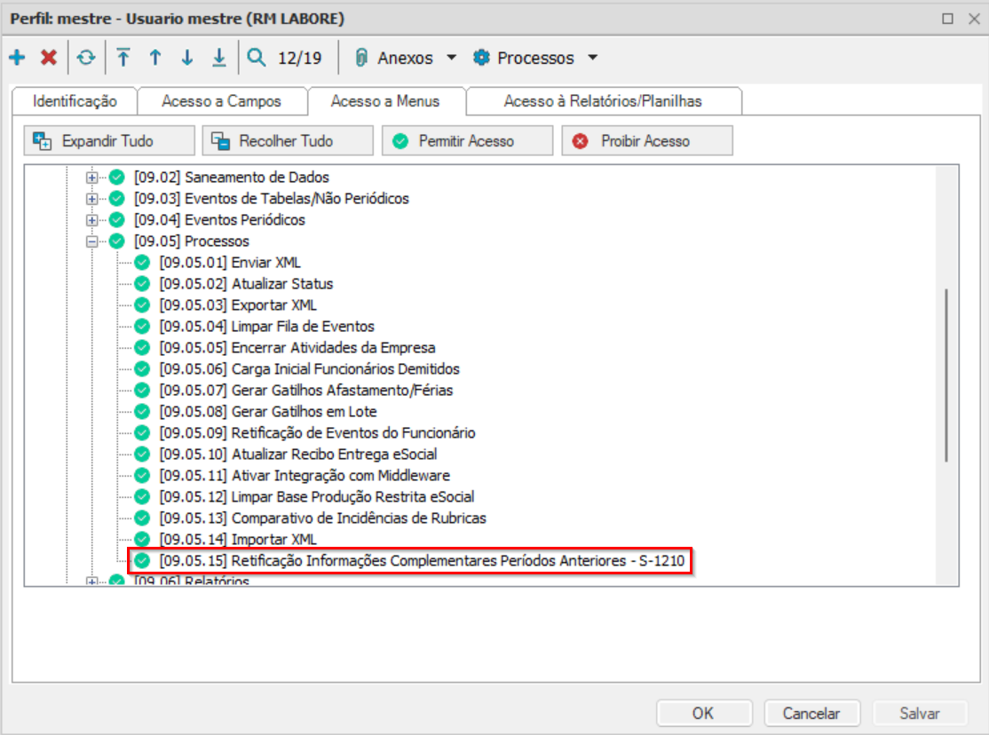 1) Acesse o menu Serviços Globais | Segurança | Perfis, selecione o sistema Folha de pagamento, edite o perfil desejado, acesse Menus e permita o acesso ao cadastro 09.05.15 - Retificação Informações Complementares Períodos Anteriores - S-1210