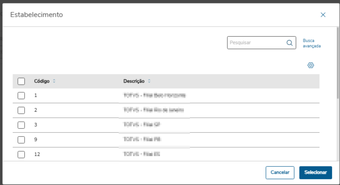 Serão listados os estabelecimentos de acordo com o envio do evento S-1005. Poderá selecionar mais de um estabelecimento.