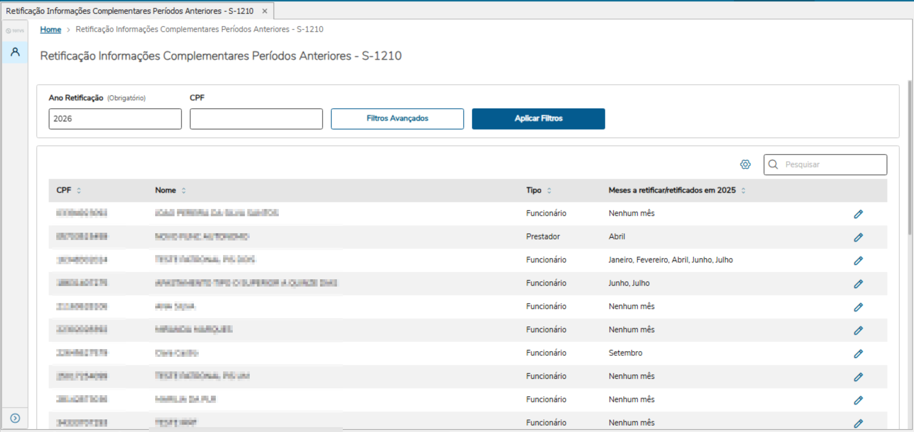 Na tela, serão exibidos todos os funcionários que tiveram o evento S-1210 transmitido ao Governo no ano imediatamente anterior ao ano definido no parâmetro Ano Retificação.