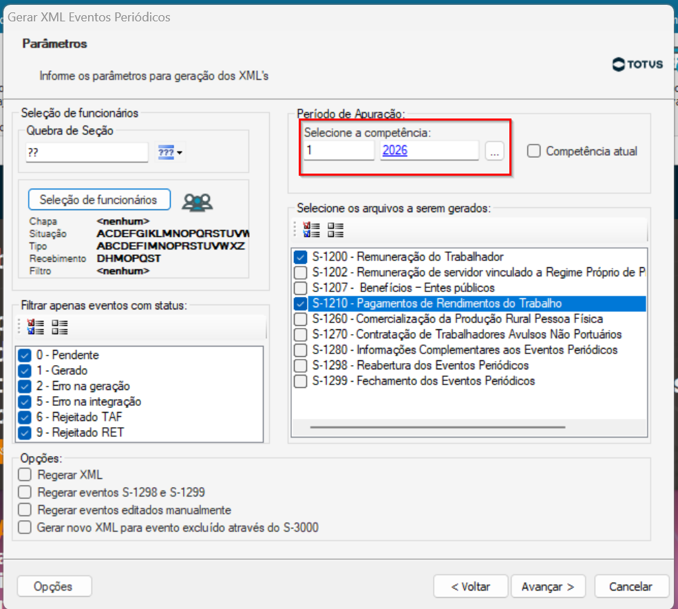 O processo utiliza o parâmetro Ano Retificação para delimitar o escopo da correção. Ao informar o ano em que a retificação será enviada (ex: 2026), o sistema identifica e lista os funcionários que, no ano imediatamente anterior (2025), possuíam eventos S-1210 transmitidos com status 10 na fila de eventos (caso possua eventos na tabela de eventos complementares é necessária a restauração dos eventos) passíveis de ajustes.