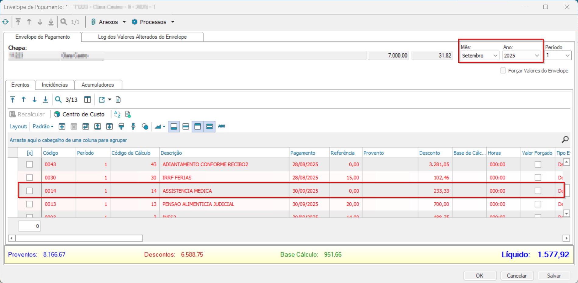 Observe que, no envelope de pagamento, o valor do plano de saúde está apresentado corretamente.