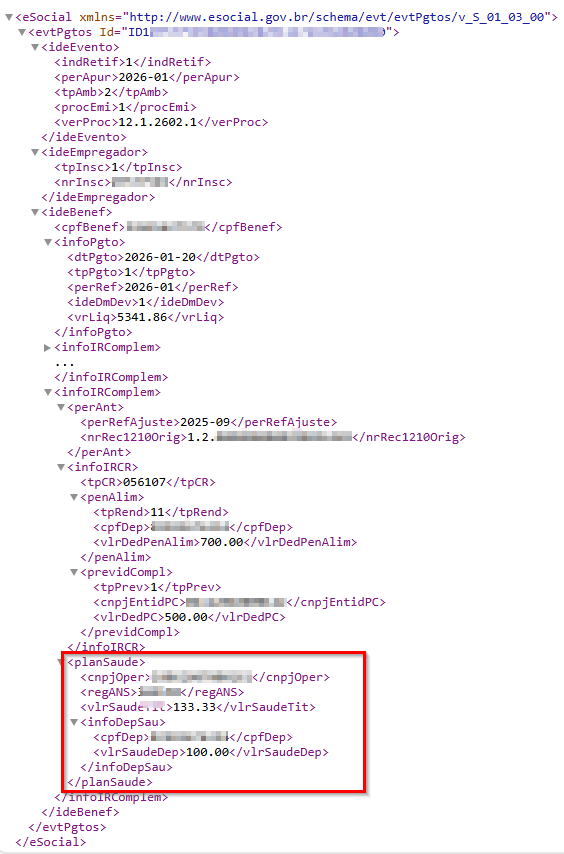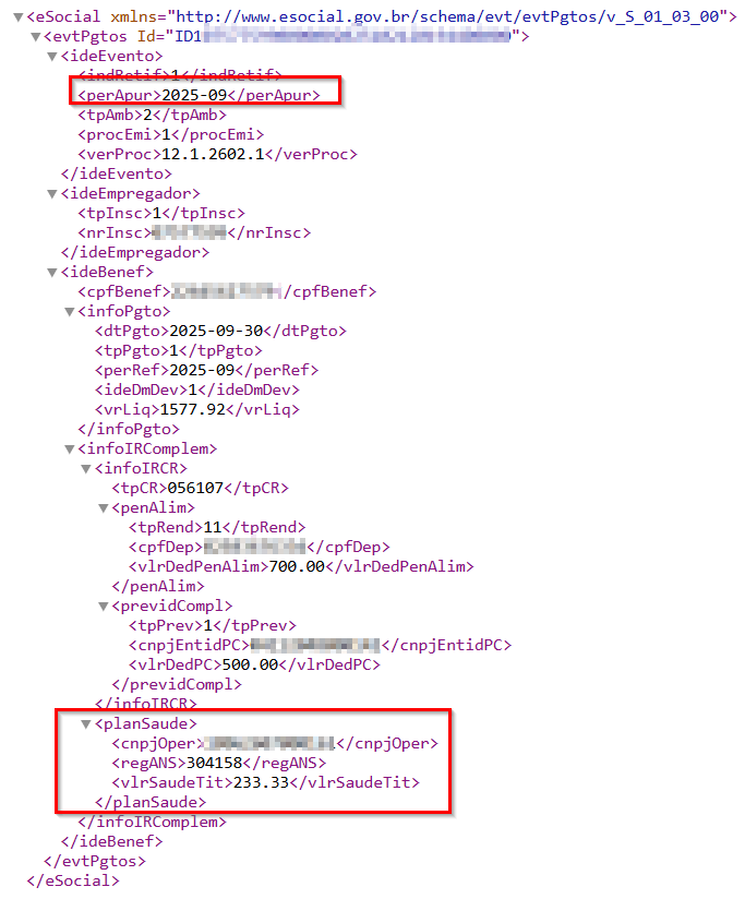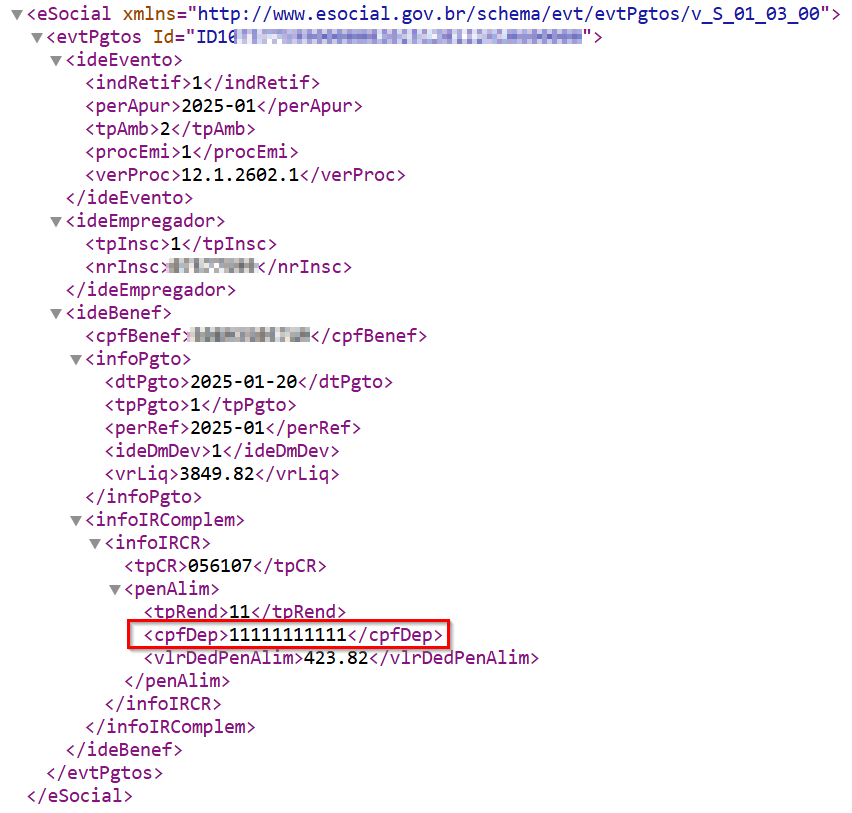 No exemplo, em 01/2025 o evento foi enviado com o desconto de pensão vinculado ao CPF 111.111.111-11.