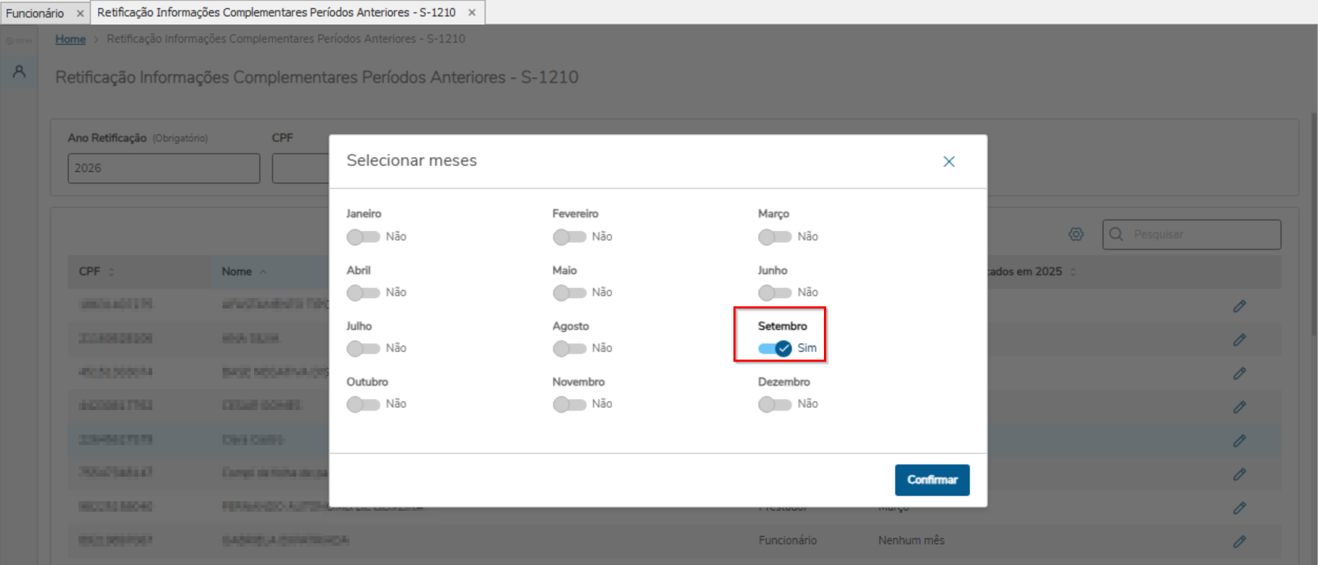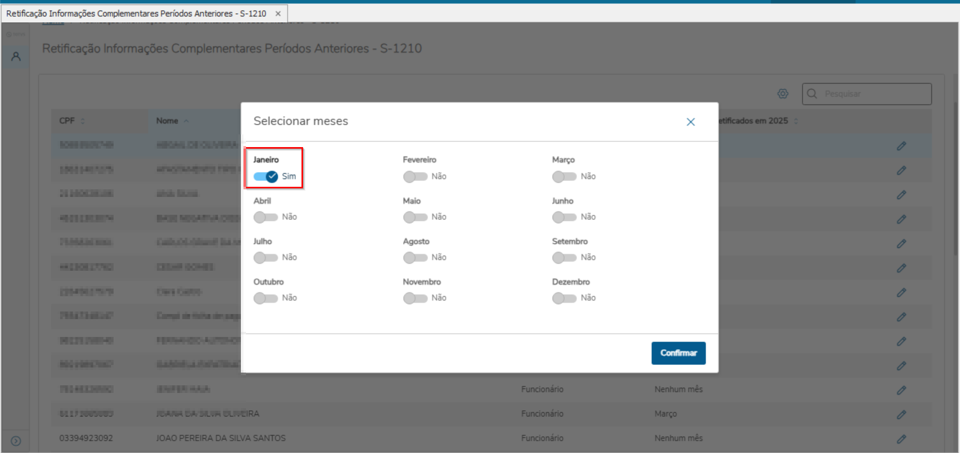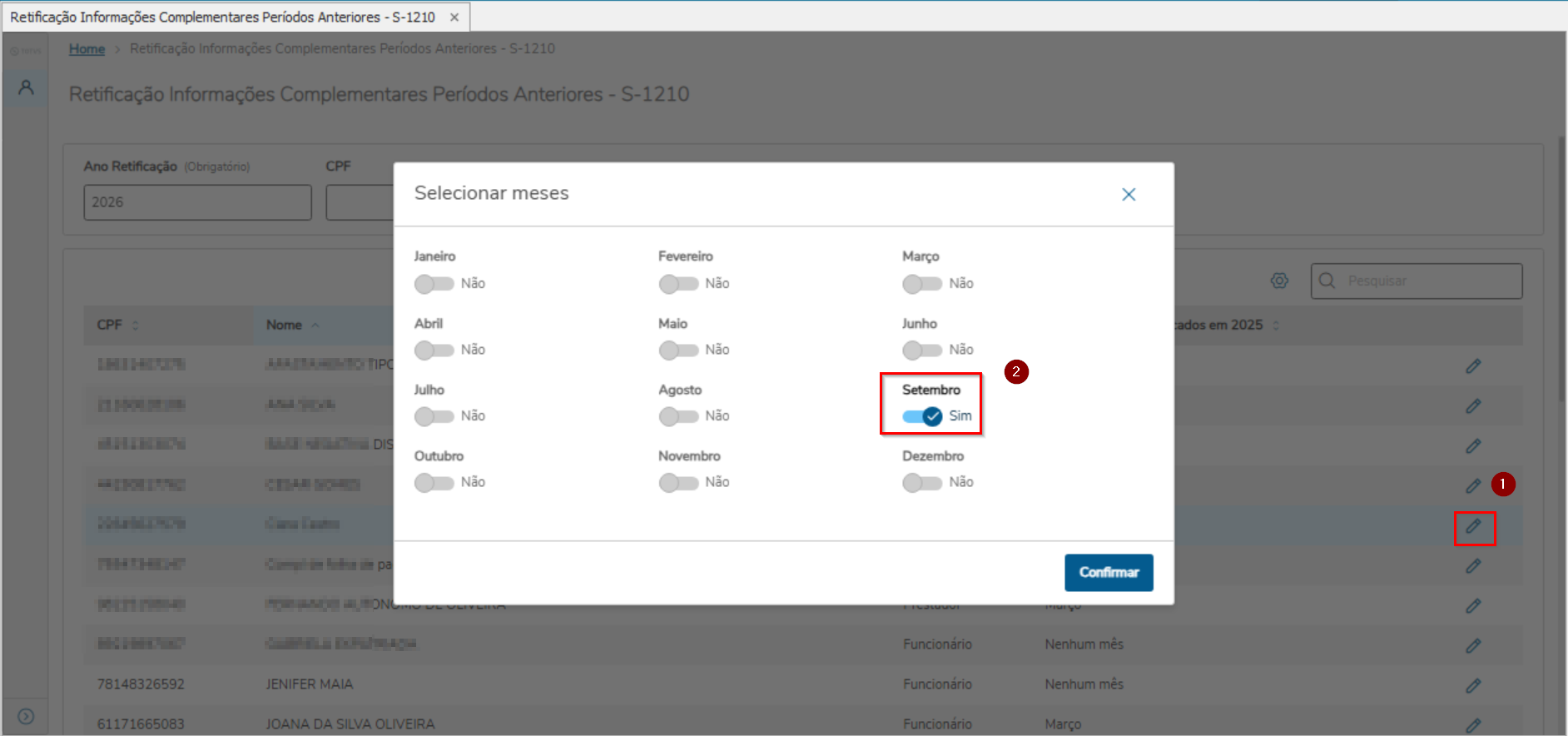 Para cada registro da lista de funcionários está disponível o botão Editar, com ícone de um lápis, onde será possível informar quais meses serão retificados.