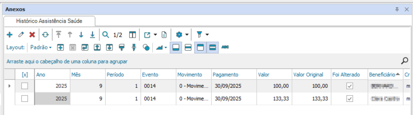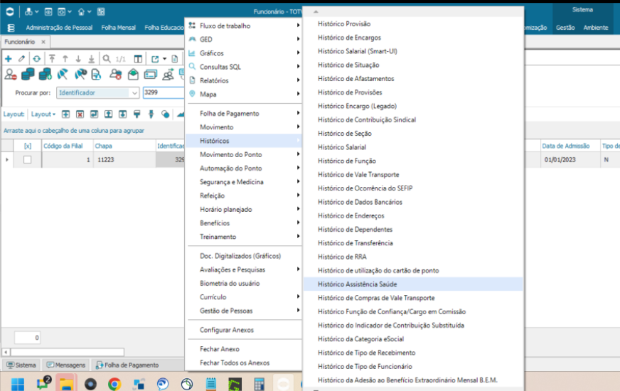 Após a verificação, foi acessado o histórico do plano de saúde e incluído o valor correspondente ao dependente em Administração de Pessoal | Funcionários | Anexos | Históricos | Históricos Assistência Saúde.