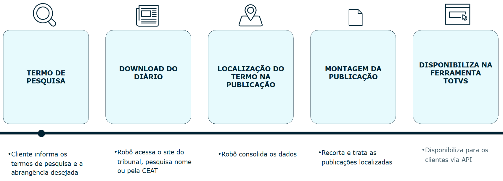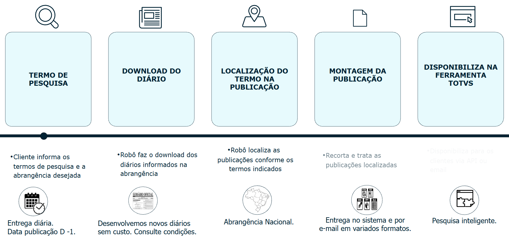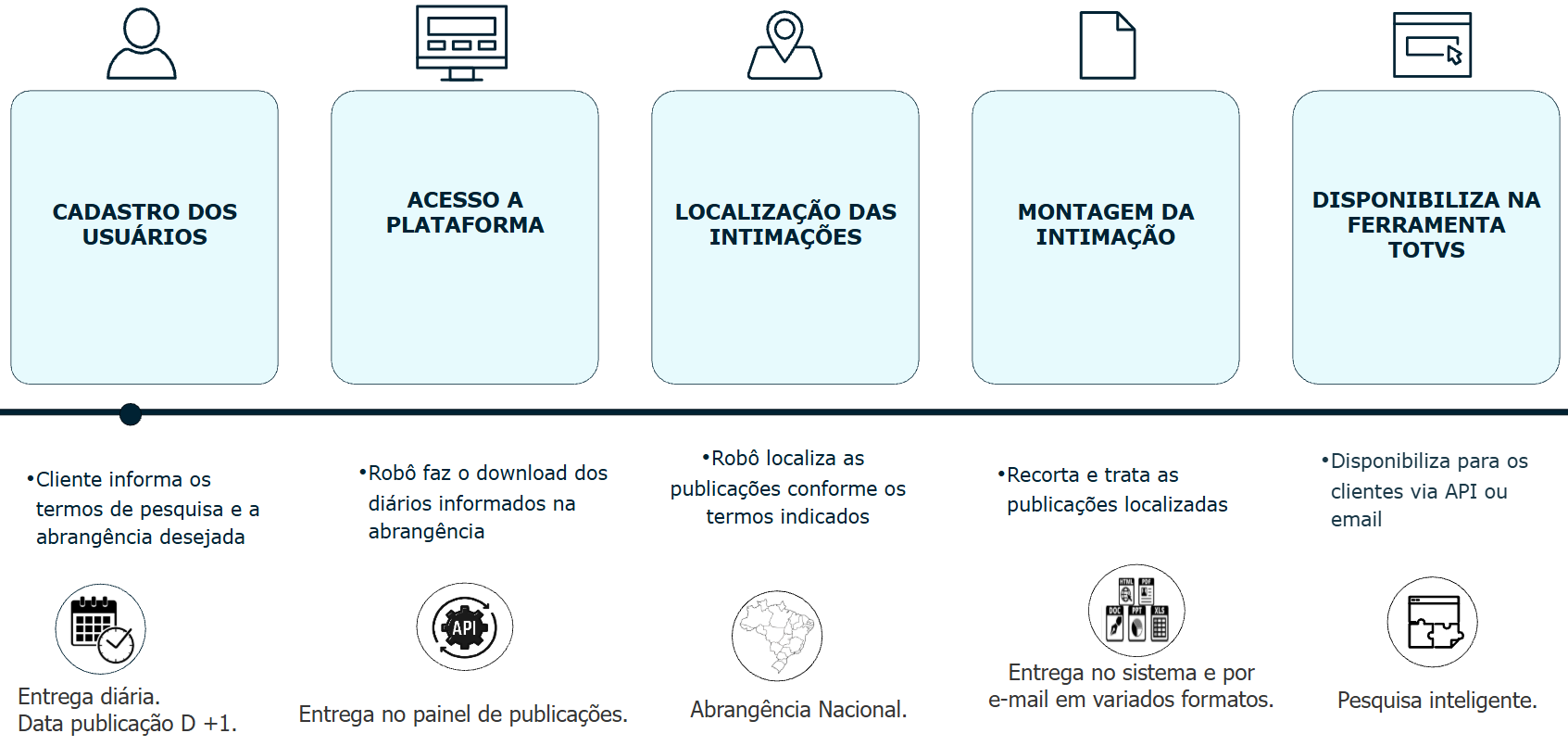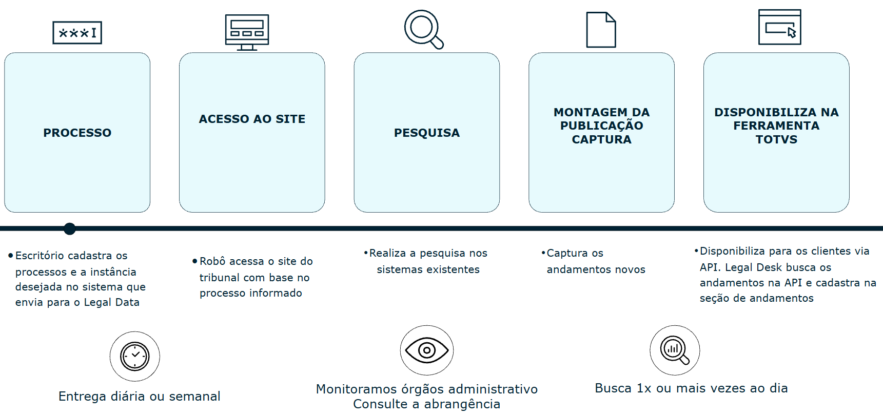 Publicações: Captura diária de intimações e publicações oficiais através dos termos de pesquisa nos Diários Oficiais e da Justiça Intimação Eletrônica: Intimações diretamente dos sistemas dos tribunais através do login/senha do advogado/empresa. Andamentos: Monitoramento de toda a movimentação processual dos processos eletrônico e físicos disponibilizados pelos tribunais. Cadastro Automático: Captura da capa do processo diretamente do sistema do tribunal a partir do número do processo no formato CNJ. Distribuições: Serviço de monitoramento diário em todos os Tribunais Judiciais do Brasil em busca de novas ações. Big Data: Mapeamento histórico de todos os processos judiciais para sua empresa.