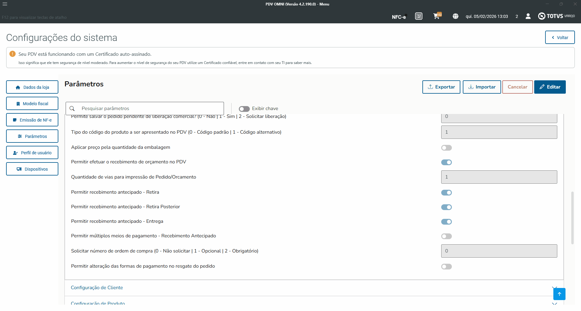 Reorganização de Parâmetros: O parâmetro 327 foi movido do grupo "Configuração SelfCheckout" para o grupo "Configuração de Atendimento", tornando-se global para o sistema.