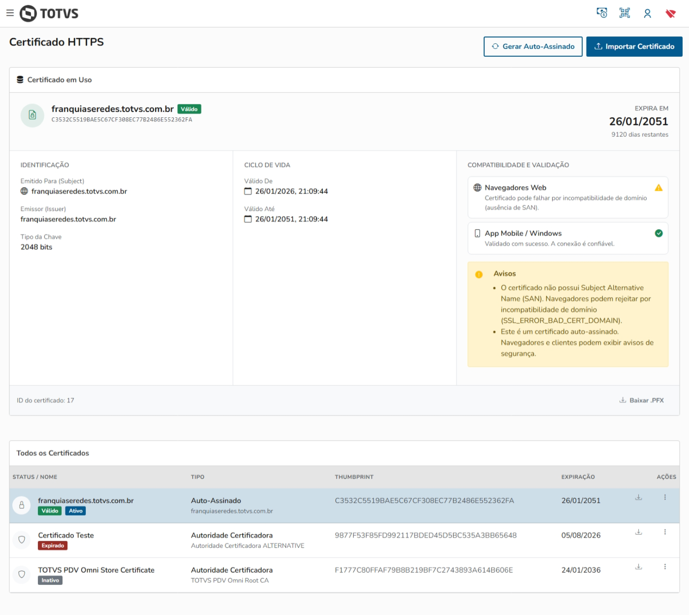 Compatibilidade e Validação: Cards informativos que validam em tempo real se o certificado é aceito por Navegadores Web e Apps Mobile/Windows, incluindo avisos sobre ausência de Subject Alternative Name (SAN).
