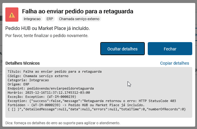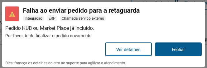 Exibição de mensagens de alerta em formato genérico no processo online no fluxo de consultar saldo de devolução na operação de troca. O pop-up deve apresentar uma mensagem genérica de forma clara para evitar a exposição desnecessária de informações técnicas, porém, deve apresentar também a opção de o operador visualizar os detalhes da mensagem quando necessário.