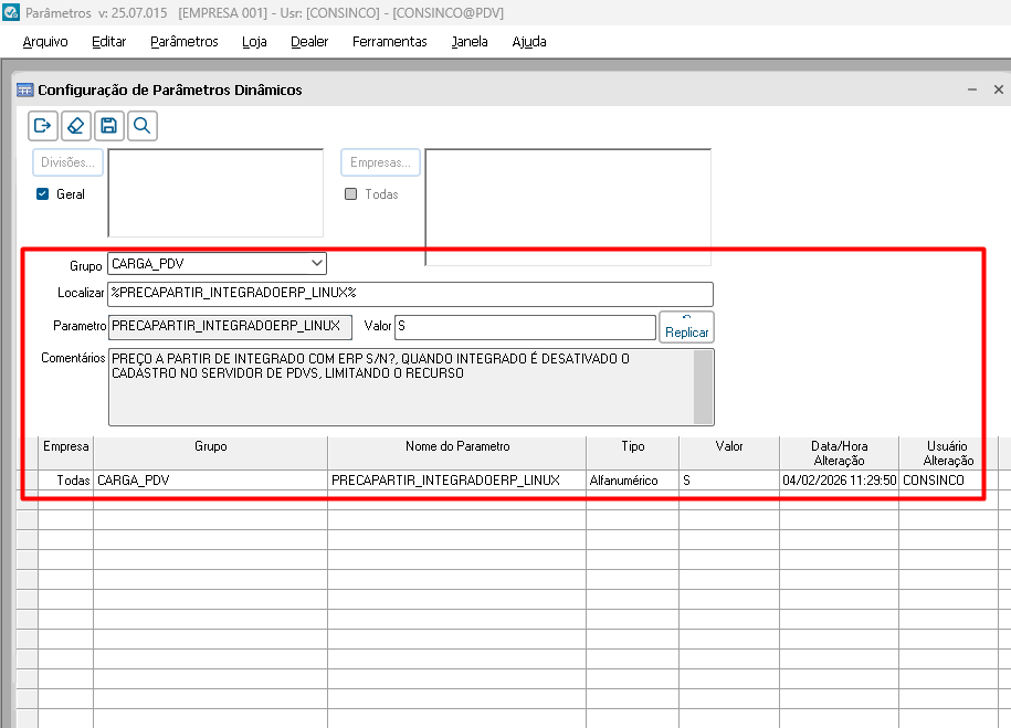 No ERP Consinco, acesse o caminho Parâmetros > Dealer > Parâmetros Dinâmicos e configure o parâmetro precapartir_integradoerp_linux como S.