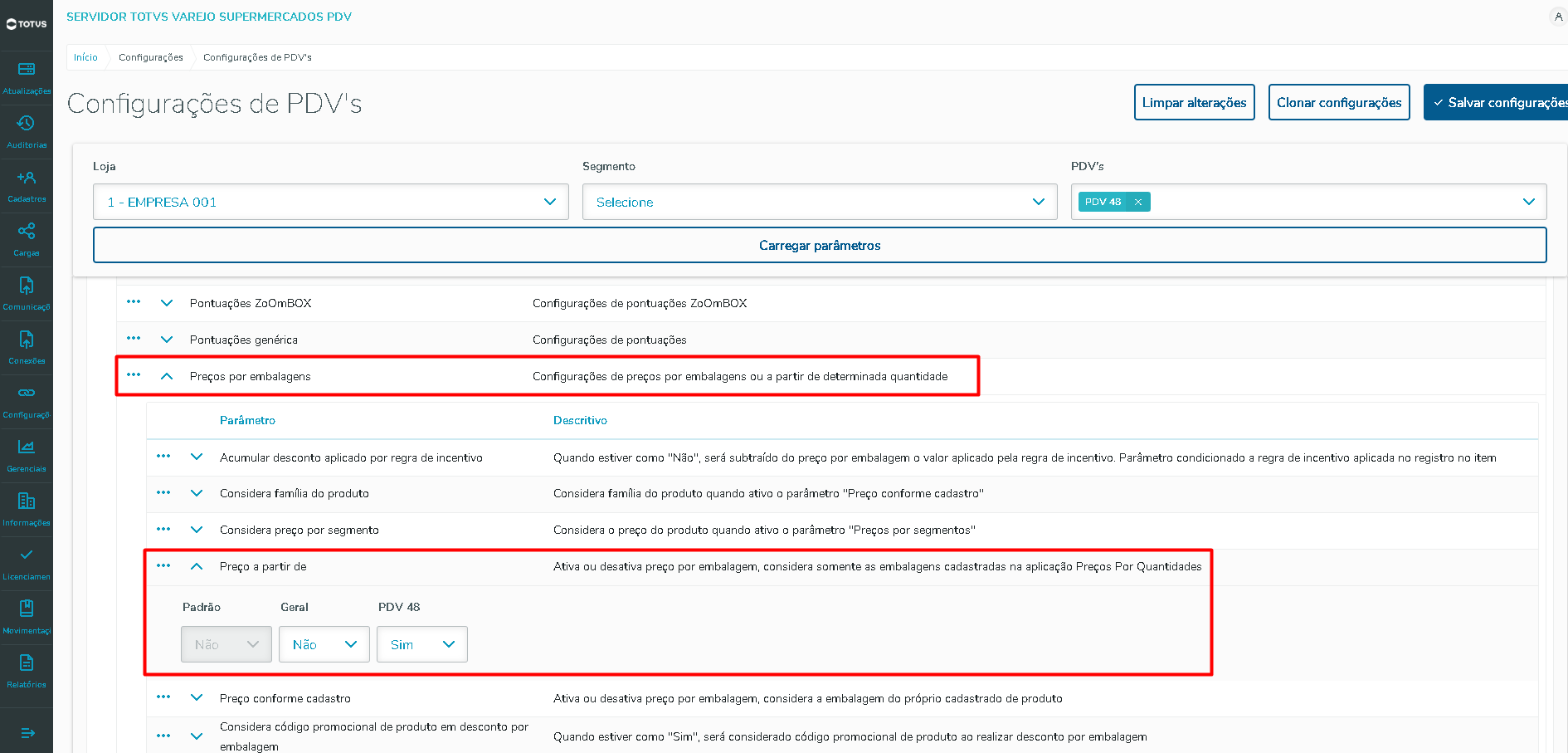No monitor de PDVs, acesse o caminho Configurações de PDVs > Regras de negócios > Preços por embalagens > Preço a partir de e ative o parâmetro como Sim.
