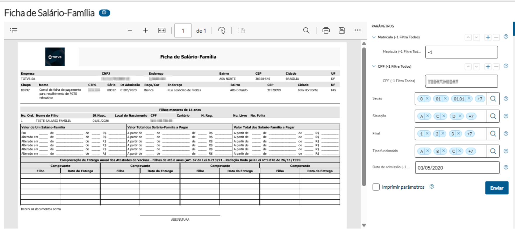 Relatório para emitir lista dos dependentes de salário-família. Nesse relatório temos os seguintes filtros disponíveis: