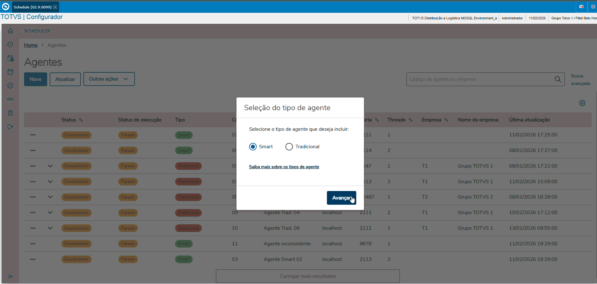 A manutenção dos Smart Agents é realizada na seção de Agentes do Schedule Protheus.