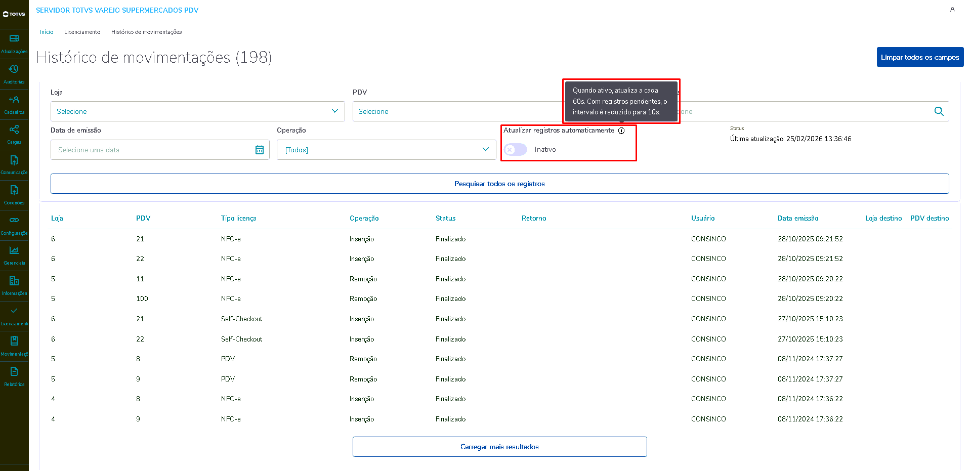 Para acompanhar movimentações em andamento, ative o toggle Atualizar registros automaticamente. Quando há registros com status Pendente, o sistema reduz o intervalo de atualização para 10 segundos. Sem pendências, o intervalo é de 60 segundos. |