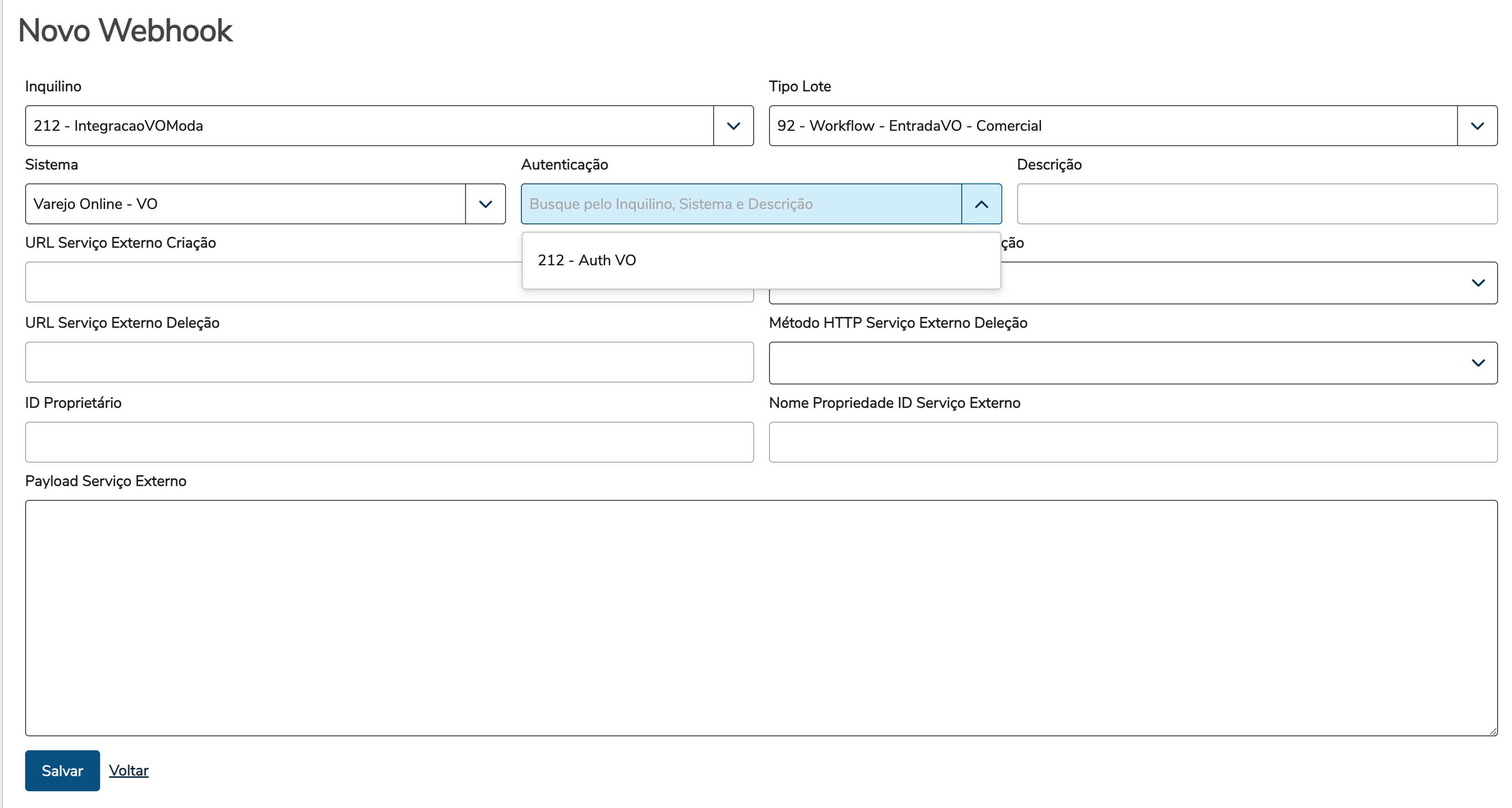 Foi incluído um campo de autenticação no cadastro do Webhook, de forma que este só será habilitado quando o usuário selecionar o inquilino e o sistema.