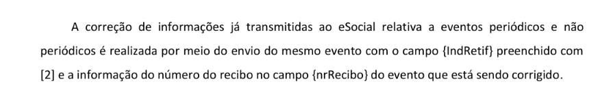 Resposta: | A correção de dados já transmitidos ao eSocial, tanto de eventos periódicos quanto não periódicos, deve ser realizada por meio do reenvio do próprio evento, devidamente identificado como retificação. Para isso, o evento deve ser reenviado com o campo {indRetif} preenchido com o valor [2], indicando tratar-se de retificação, e com o campo {nrRecibo} contendo o número do recibo do envio original a ser ajustado. O primeiro envio de um evento, realizado com {indRetif} = [1], é considerado como registro original, conforme previsto no MOS.