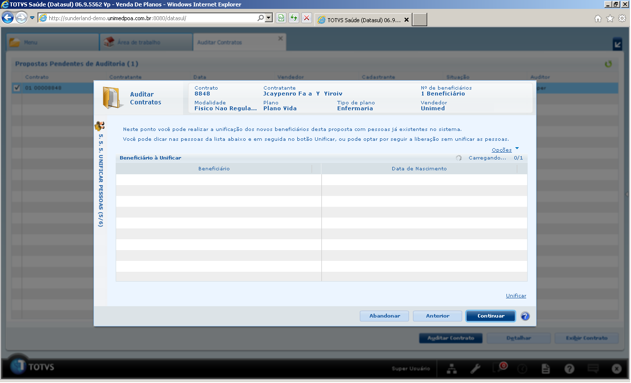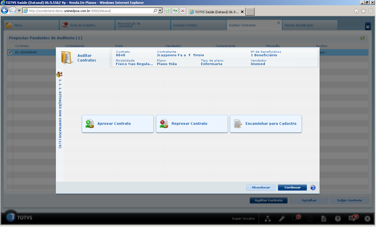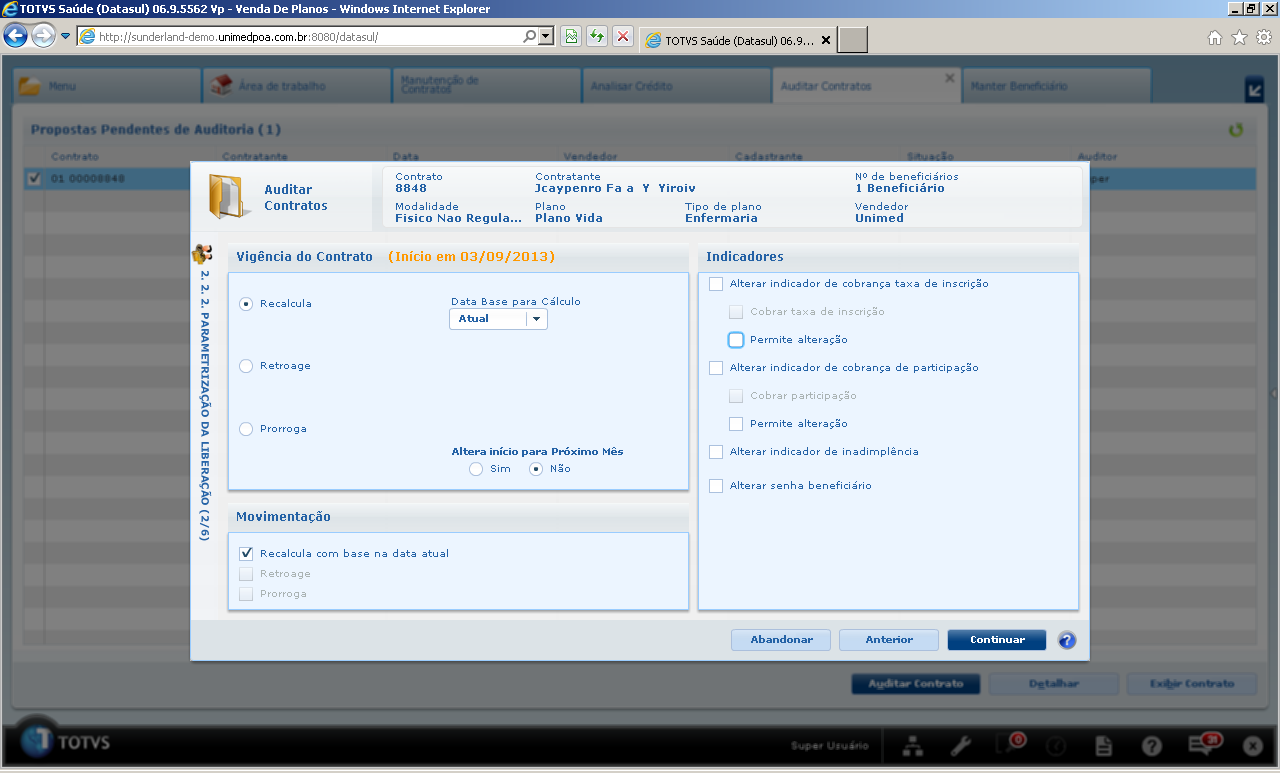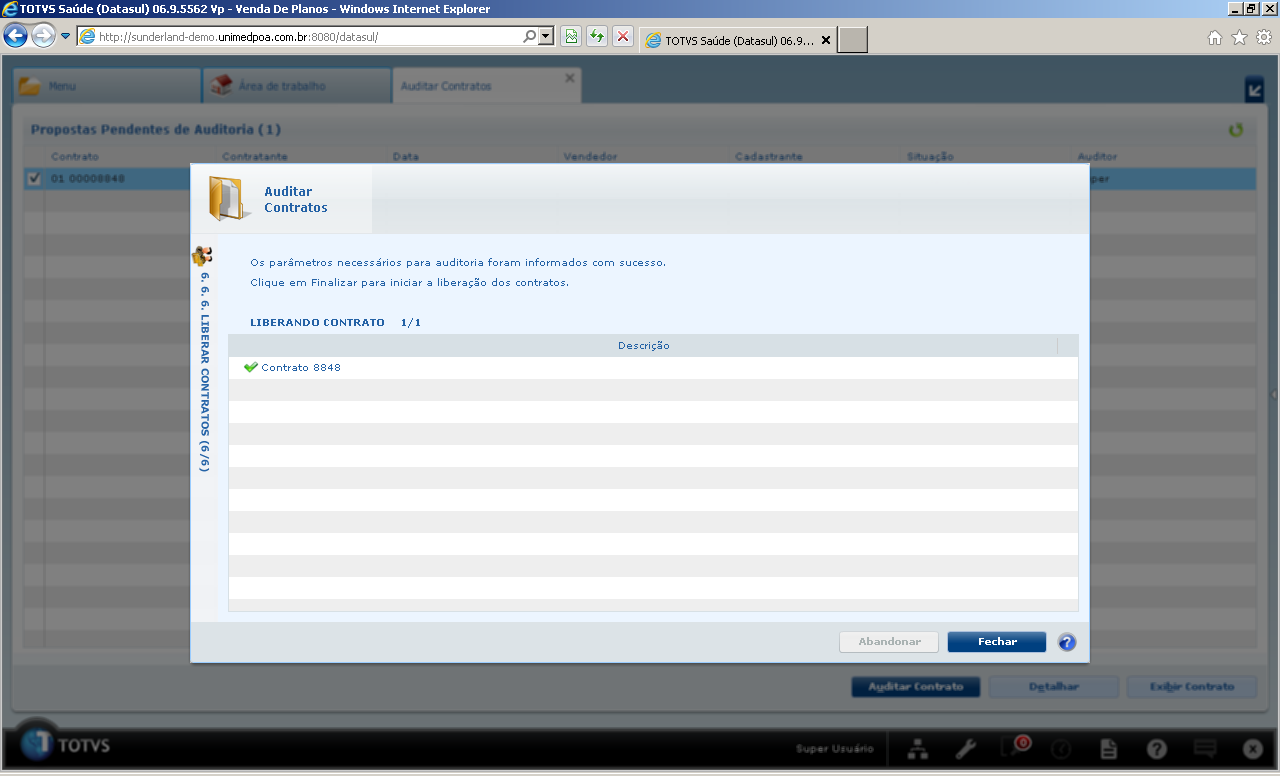 Na etapa 6 - liberação de contratos, o sistema verifica os parâmetros informados e confirma a aprovação do contrato. Com isso, o contrato está na situação “5-Aprovado” e recebe um número de termo, sendo que, os beneficiários são alterados para a situação “5-liberado”. Neste movimento, o contrato/beneficiário estão liberados para o faturamento.