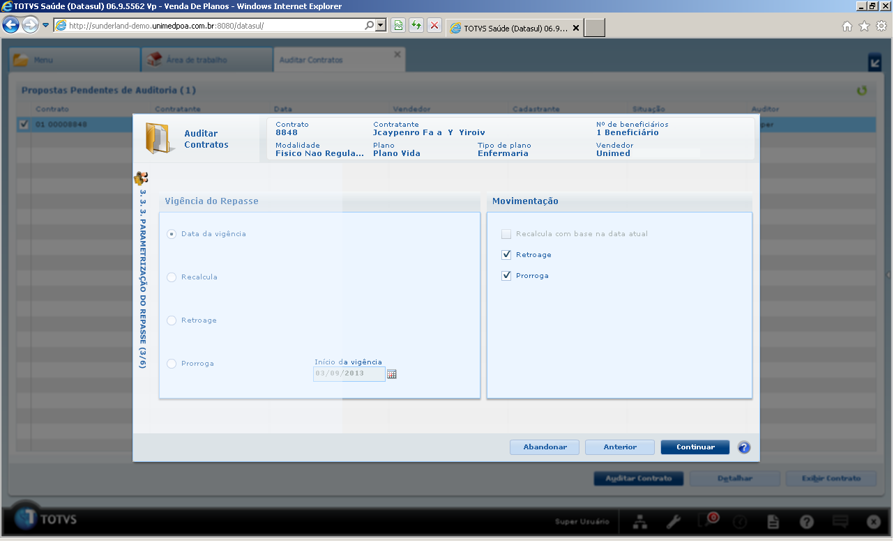 Clique em “Continuar” para validar os parâmetros de repasse (caso o contrato possua beneficiários repassados).