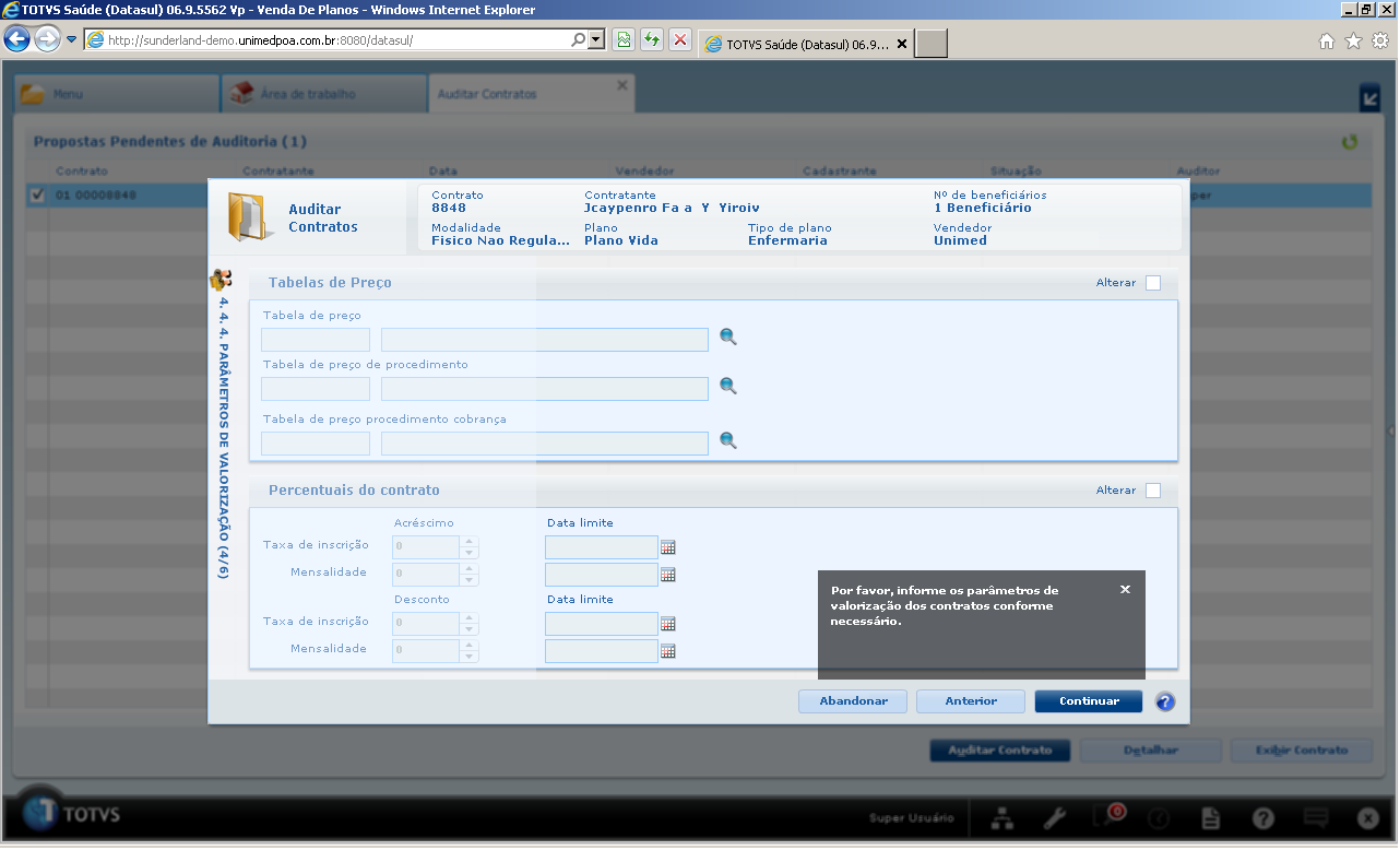 Clique em “Continuar” para validar os parâmetros de valorização. Esta tela permite alterar (caso necessário) a tabela de preço, tabela de pagamento e cobrança, percentuais de acréscimo e percentuais de desconto do contrato.