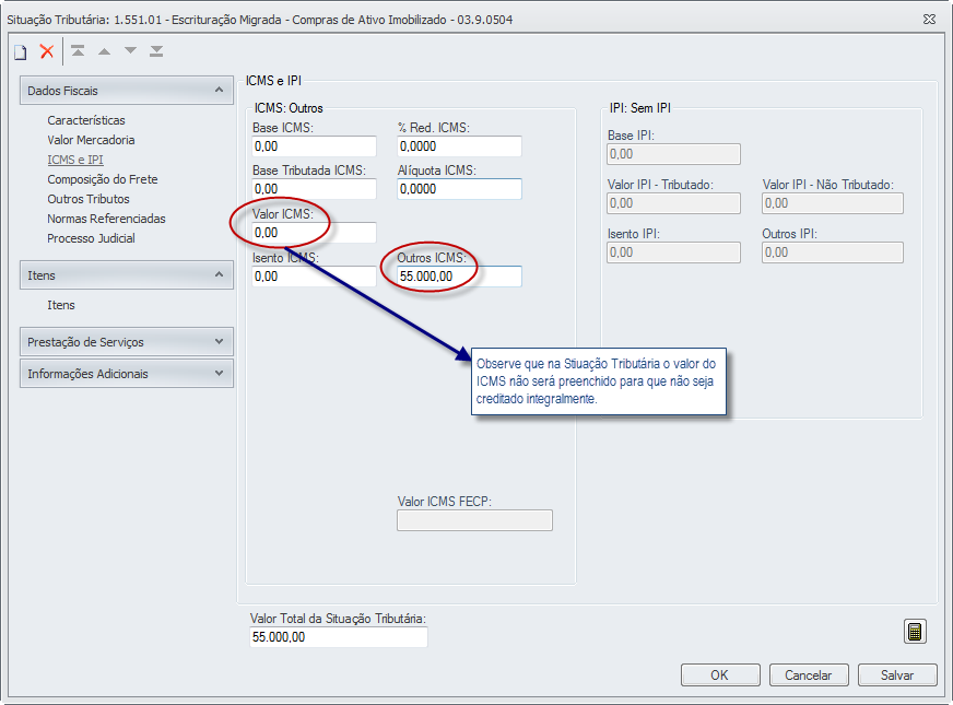 Situação Tributária Todos os campos do lançamento incluído através do processo Escrituração de Lançamento, serão gravados automaticamente visto que essas informações já foram inseridas no módulo TOTVS Gestão de Estoque, Compra e Faturamento. Nesse tipo de operação o valor total da mercadoria e carregado no campo "Outros ICMS" Item