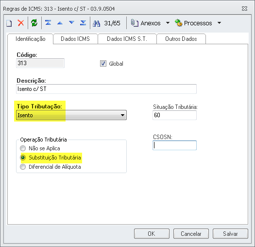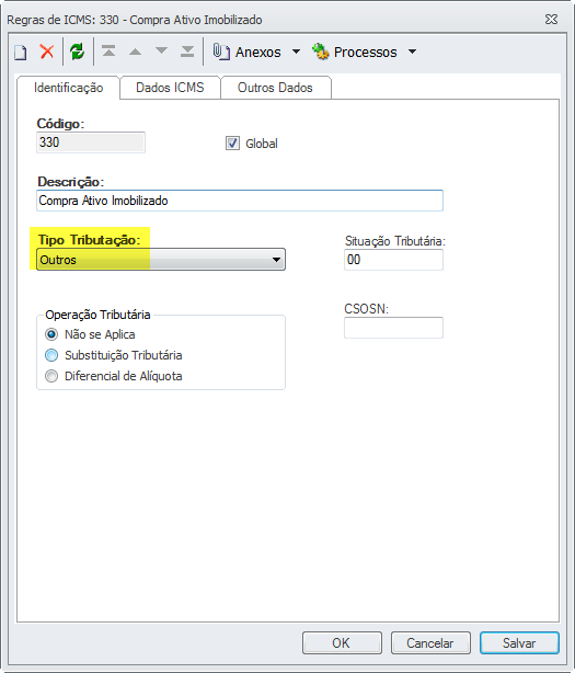 Preencher apenas o campo Situação Tributária de Entrada/Saída