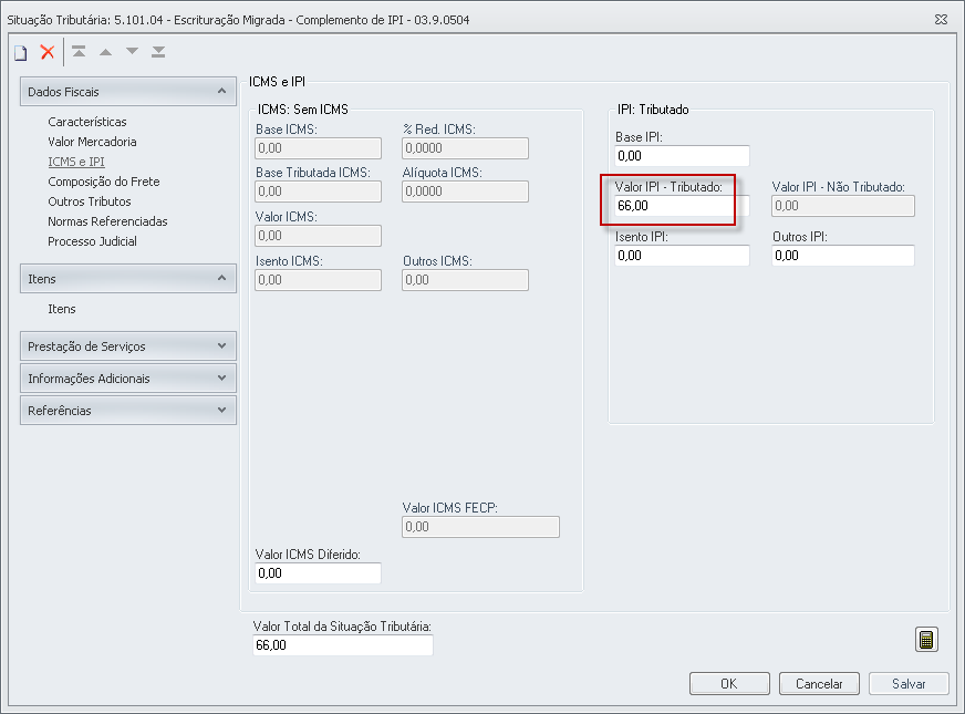 IPI é um tributo administrado pela Receita Federal, não cumulativo e que incidente sobre a industrialização de produtos manufaturados. Se trata de um tributo de carácter seletivo, ou seja, alíquota que é definida pelo governo Federal através da TIPI - Tabela de Incidência do Imposto sobre Produtos Industrializados que privilegia bens de maior essencialidade com alíquotas menores/isentas enquanto para bens de menor essencialidade ela onera, como é o caso do cigarro que pode chegar a 300%. Nas situações a seguir serão demonstradas algumas características do IPI nas operações de entrada e saída de mercadoria para industrialização. No Tipo de Tributação = Normal o valor do IPI será somado ao valor total da nota fiscal. Nesse exemplo vamos demonstrar a parametrização do IPI para as seguintes CST's: Identificação Tipo Tributação: Tributado