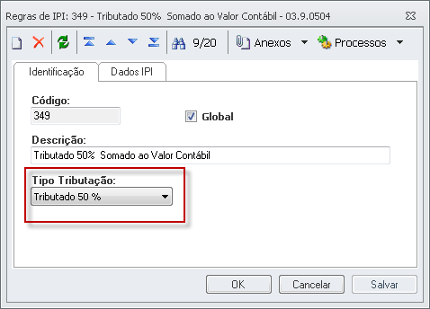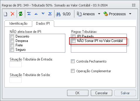 Identificação Tipo Tributação:Tributado 50% Dados do IPI Regras Tributárias: NÃO Somar IPI no Valor Contábil desmarcado |