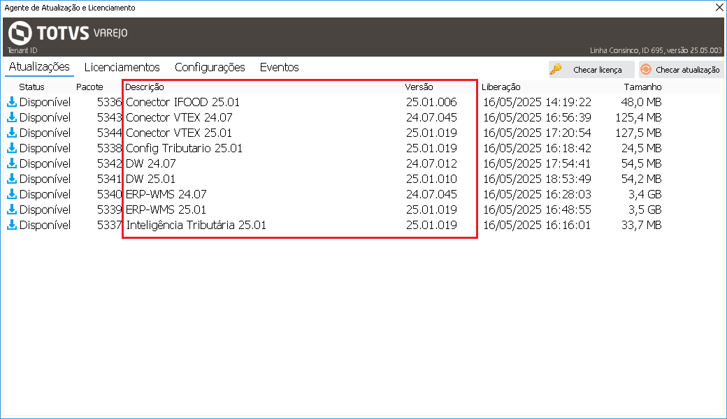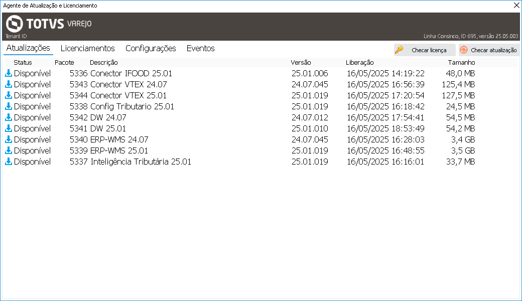 Os pacotes de atualização são disponibilizados no Agente de Atualização e Licenciamento assim que liberados pelo processo de expedição, com cadência semanal.
