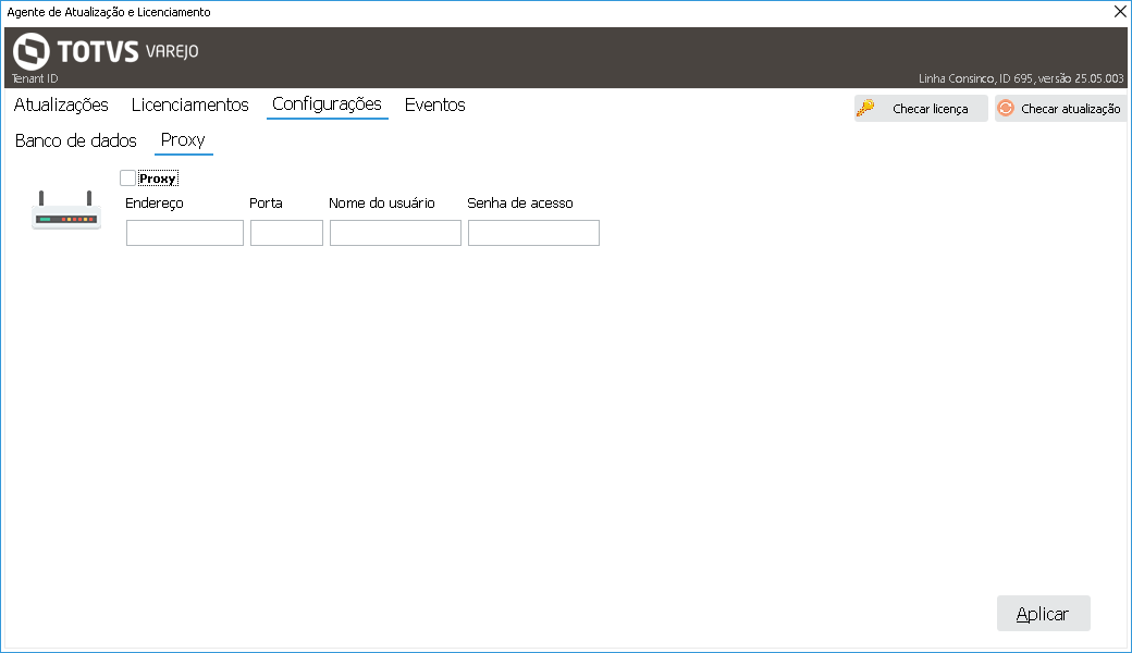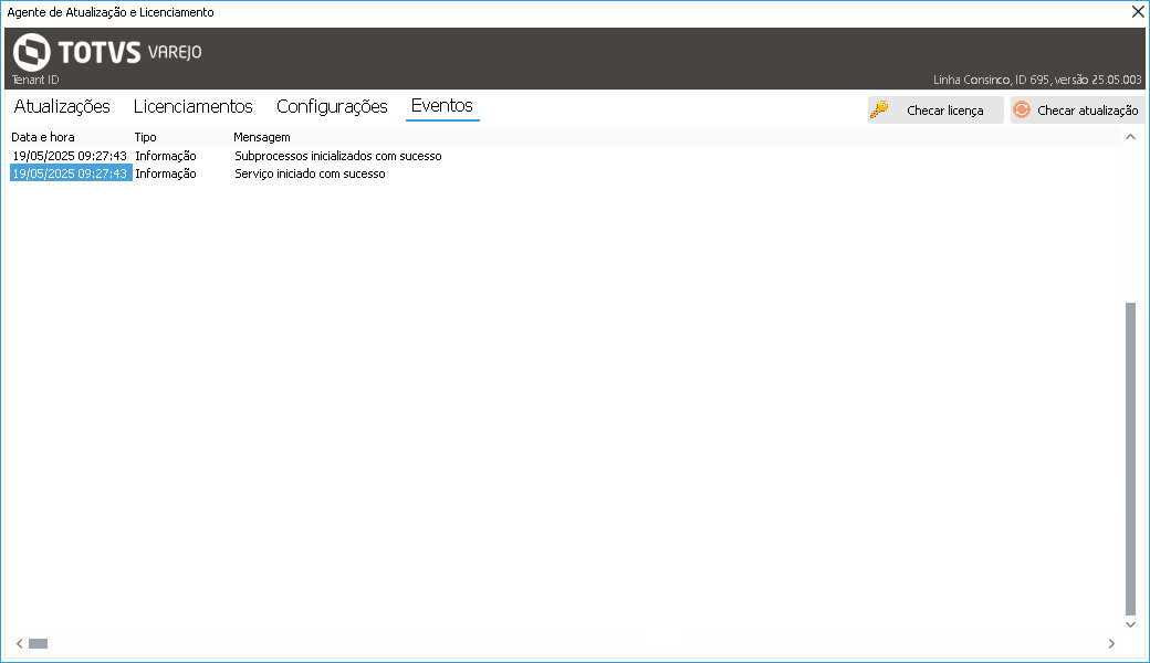 Ao abrir o Agente, será visualizada a tela principal da aplicação, com as abas Atualizações, Configurações, Eventos e os botões Checar licença e Checar atualização, conforme demonstrado baixo abaixo.